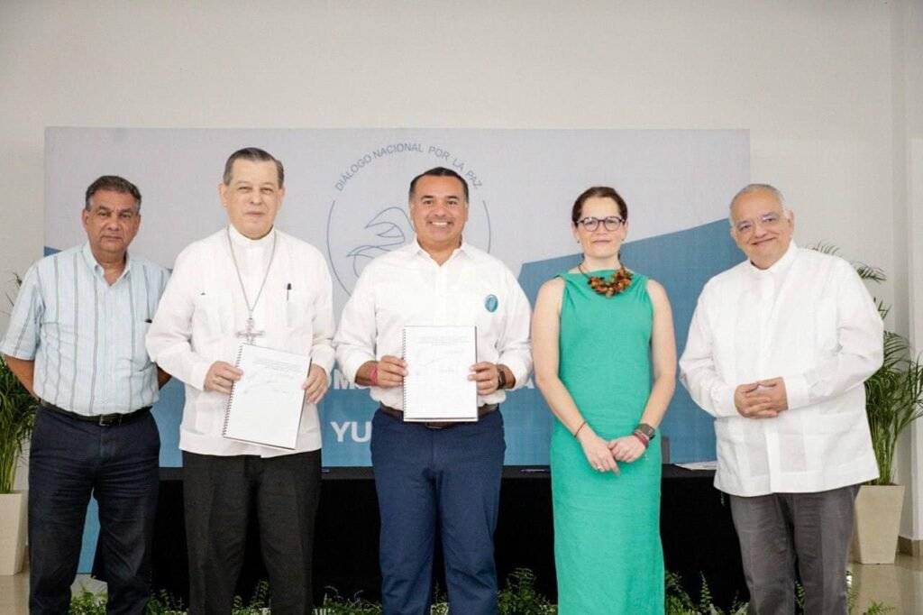En este día 81 de campaña por la gubernatura del estado, el candidato Renán Barrera, firmó un compromiso por la paz de Yucatán ante el arzobispo Gustavo Rodríguez Vega, la coordinadora nacional del proyecto Diálogo Nacional por la Paz, Ana Paula Hernández y el presidente de USEM Mérida, Alfonso Páez.