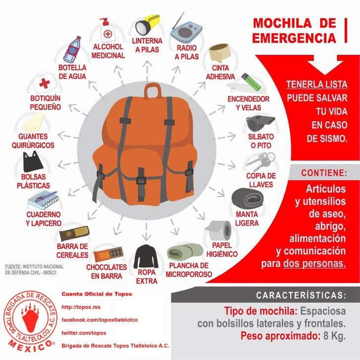 Ésta debe tener documentos importantes, como actas de nacimientos, identificaciones y las escrituras de la casa o el contrato de renta; incluye linterna; ropa para dos días; botiquín; radio; silbato y demás.