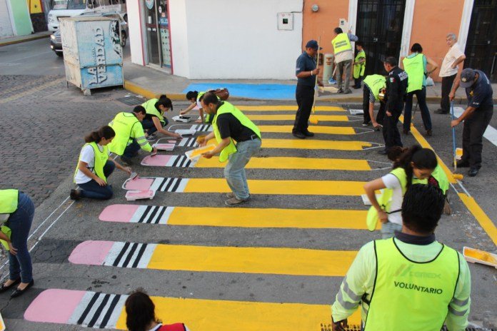 Ayer fue pintado el primer paso peatonal de la ciudad cuyas barras de señalización amarillas, ahora tienen un acabado artístico con forma de lápices, que por lo mismo, el cruce será más evidente, manteniendo los criterios y normas de las señales viales reglamentarias.