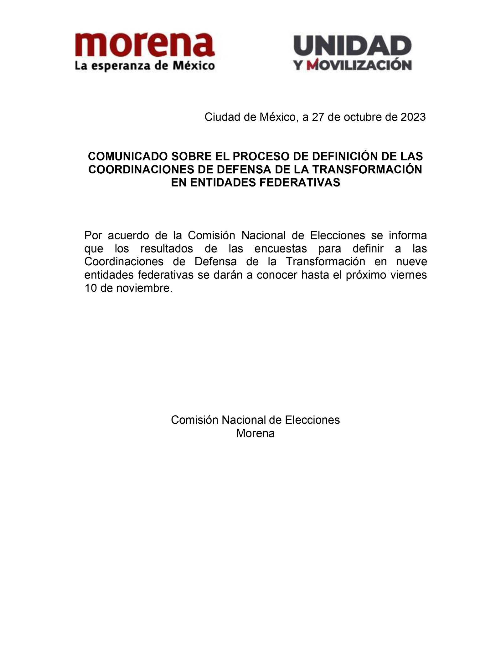 Sin mayores detalles, Delgado Carrillo dijo que la Comisión Nacional de Elecciones modificó la fecha para informar sobre las coordinaciones de defensa de la Cuarta Transformación en 8 entidades y la Ciudad de México.