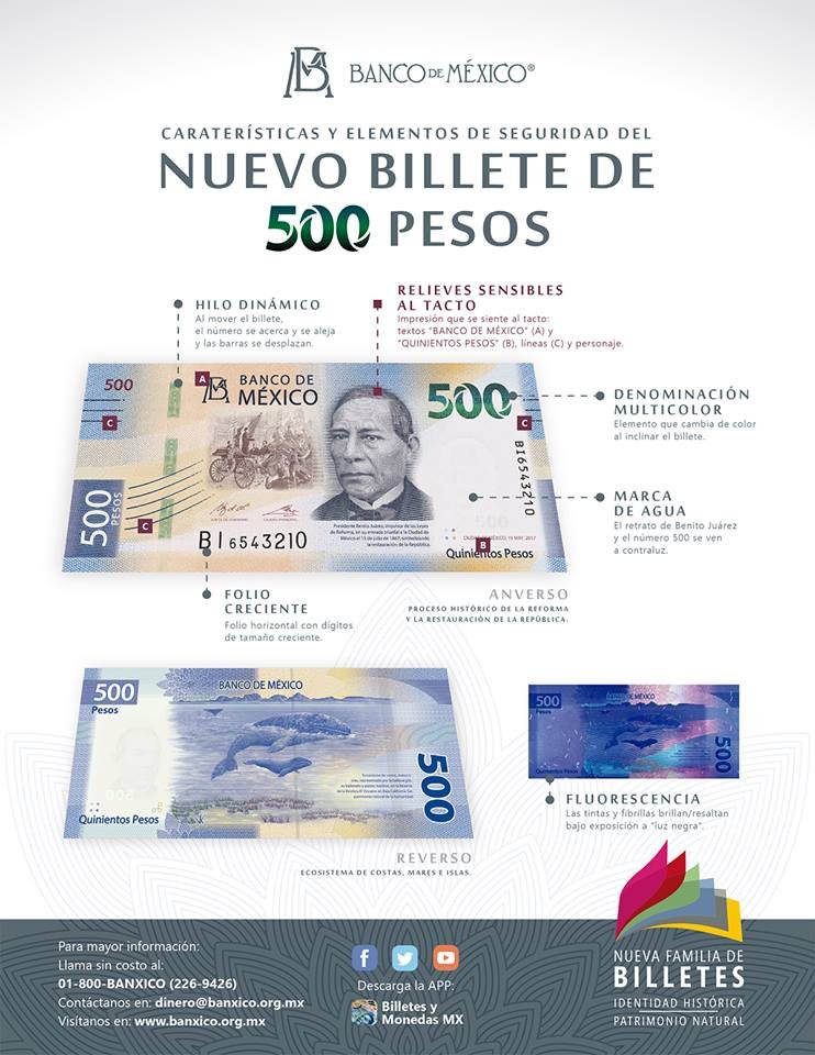 A pesar que la pieza de 500 pesos tiene el mismo retrato de Benito Juárez que el de 20 pesos, y comparte también un color azul, explica que el nuevo billete es 2 centímetros más largo. Y presenta claras diferencias al tacto.