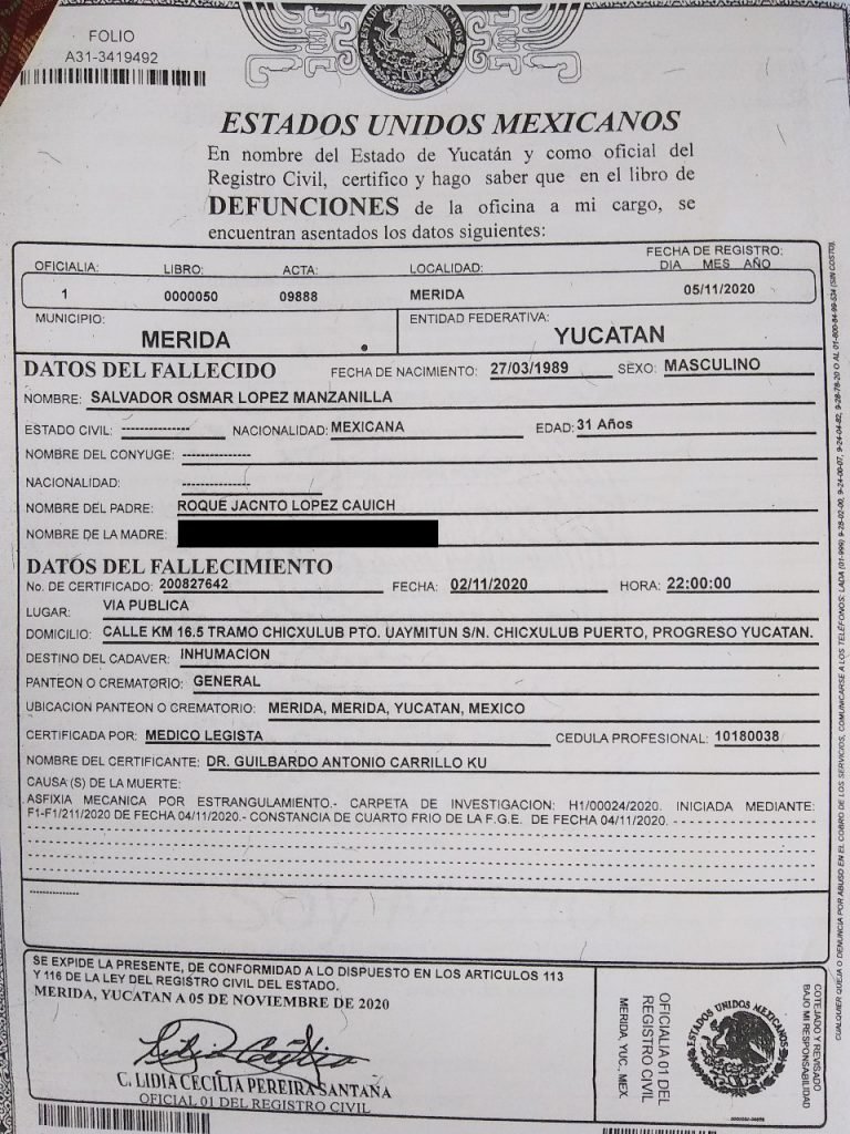 -Resultados periciales que tengo de la Fiscalía General del Estado de Yucatán que mi hijo no falleció de un infarto como reportó la policía, sino por asfixia mecánica por estrangulamiento, es decir, a mi hijo lo asesinaron, -dijo don Roque.