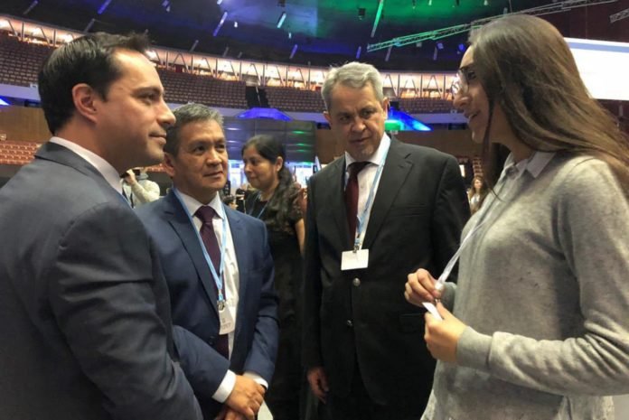 2.- En el marco de la Conferencia de las Partes sobre el Cambio Climático (COP24), el Gobernador Mauricio Vila Dosal dialoga con el subsecretario de Gestión para la Protección Ambiental de la Secretaría de Medio Ambiente y Recursos Naturales (Semarnat), Sergio Sánchez Martínez, el embajador de México en Polonia, Alejandro Negrín Muñoz y la joven mexicana, Andrea Sofía Rosales Vega, ganadora del Concurso mundial de vídeo: jóvenes y cambio climático en la categoría Producción y consumo responsable.