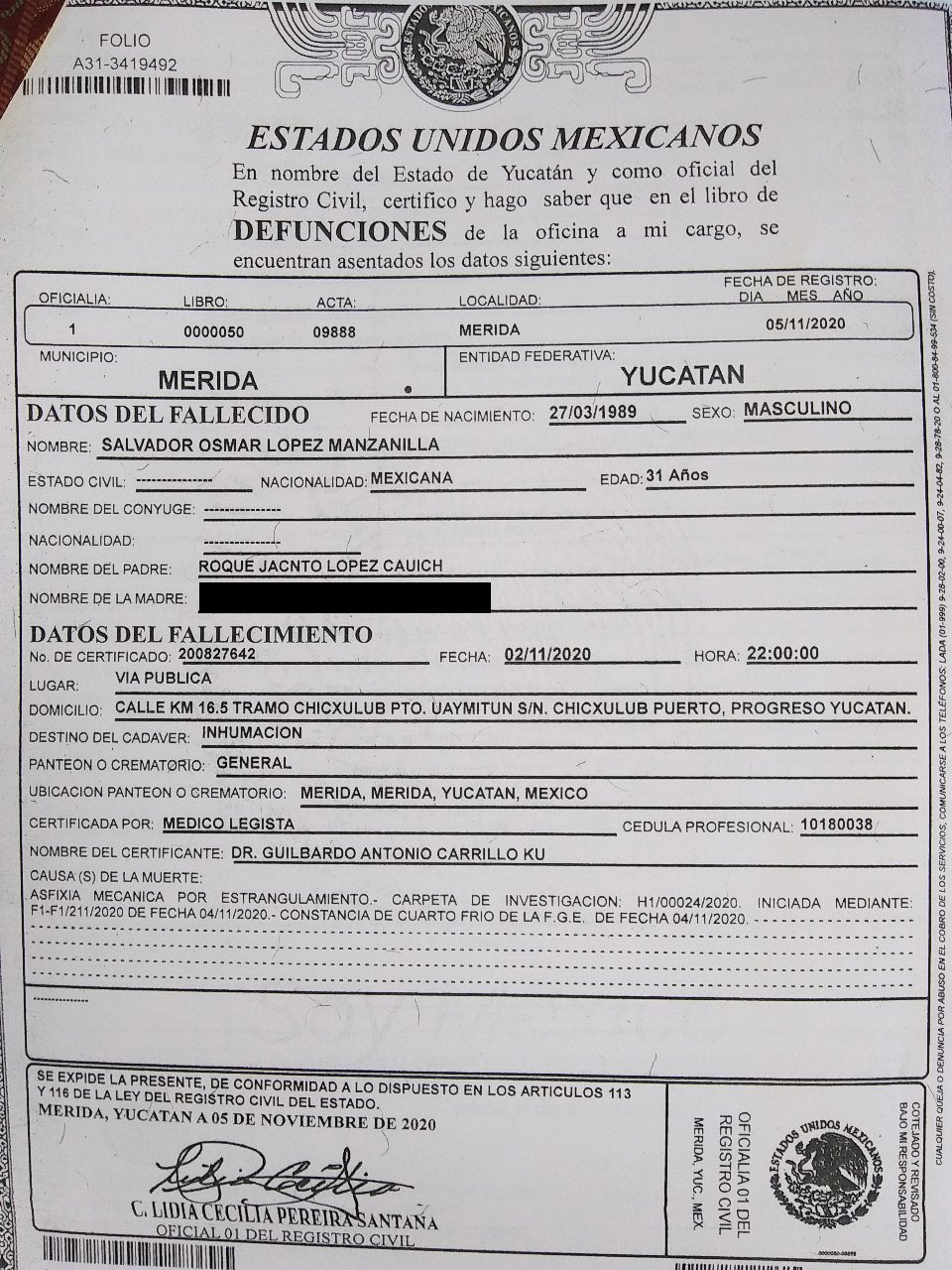 «Asfixia mecánica por estrangulamiento» es la causa oficial de muerte, según el acta 9888 del libro 050 del Registro Civil, de Salvador Osmar López Manzanilla, quien el pasado 3 de noviembre murió cuando estaba bajo custodia de agentes de la Secretaría de Seguridad Pública (SSP).