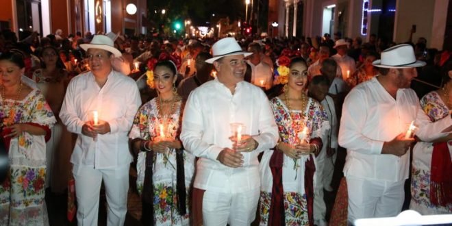 Ataviado con el traje regional, el primer edil acompañado de directores municipales caminó a la cabeza de la larga columna de trovadores de las distintas asociaciones locales e integrantes del Ballet Folclórico titular del Ayuntamiento, que salió a las 11 de la noche del parque de Santa Lucía, sobre la calle 60, para dirigirse a los bajos del Palacio Municipal.