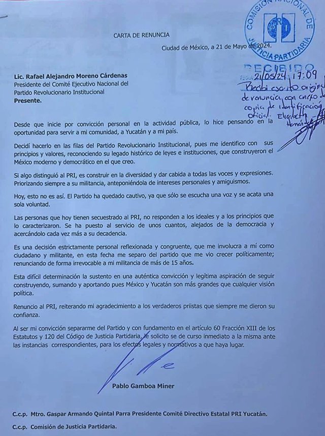Mediante una “carta renuncia”, fechada el día de hoy 21 de mayo y con el sello de recibido a las 17:09 en la sede nacional del PRI, Gamboa Miner expone al líder nacional Alejandro Moreno Cárdenas que “Desde que inicié por convicción personal en la actividad pública, lo hice pensando en la oportunidad para servir a mi comunidad, a Yucatán y a mi país”.
