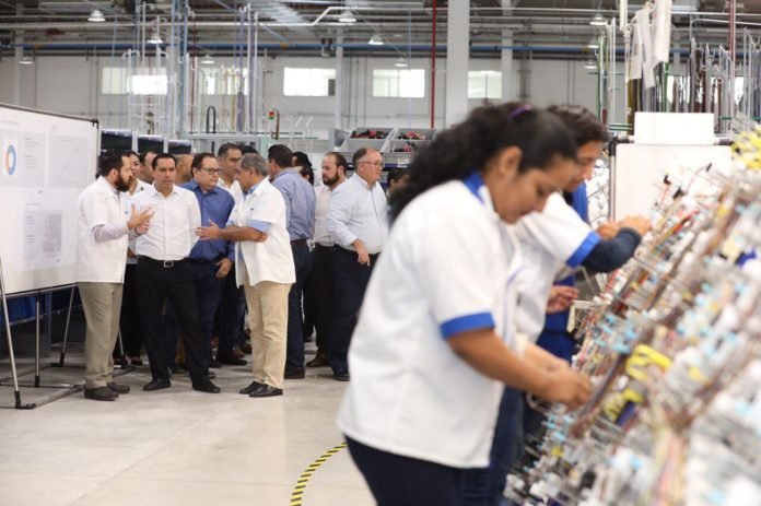 Acompañado del director de Leoni para América, José Conceicao, el titular del Poder Ejecutivo realizó un recorrido por las instalaciones de dicha fábrica dedicada a la manufactura de arneses electrónicos y cables  para su aplicación en la industria automotriz, que  ya cuenta con la primera de sus dos fases en operación.