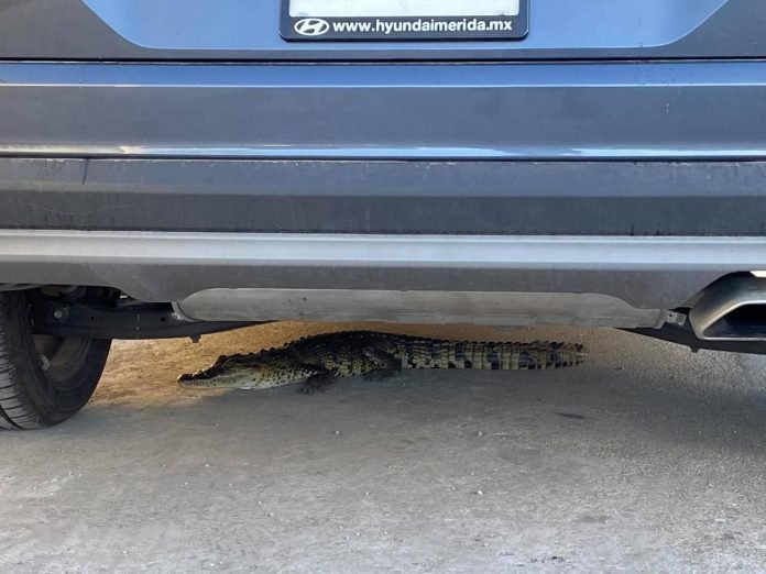 Enorme susto se llevó un persona n el fraccionamiento Las Américas, al encontrar un cocodrilo debajo de un vehículo en el fraccionamiento. El animal se encontraba debajo de una camioneta Hyundai Tucson, estacionada en la calle 100-1 con 53 y 51-D.