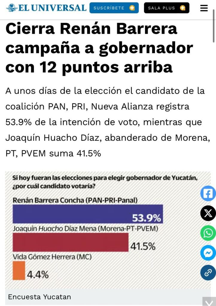 En sus redes sociales, Renán Barrera Concha, candidato común a la gubernatura del PAN, PRI y Nueva Alianza, difundió una encuesta del periódico capitalino “El Universal”, según la cual, a unos días de la elección el panista se mantiene sólido y consistente en las preferencias de los electores yucatecos.