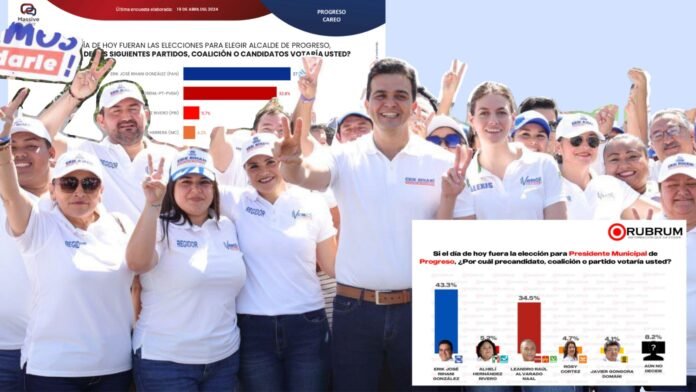 Con una contundente muestra de apoyo, las encuestas revelan que Erik Rihani González, candidato del PAN, está en camino de convertirse en el próximo alcalde de Progreso. Tanto la casa encuestadora RUBRUM como Massive Caller coinciden en señalar a Rihani como el virtual ganador de la Presidencia Municipal, con un amplio margen de preferencia electoral a su favor.