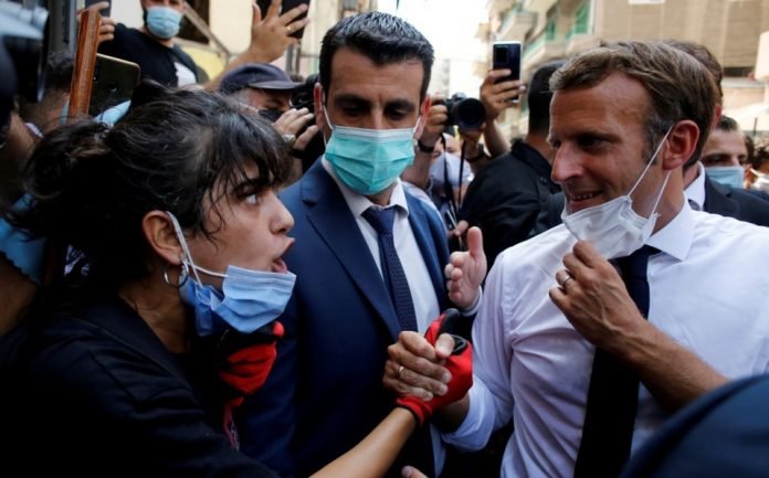 Los afectados gritaron consignas en francés alrededor de Emmanuel Macron exigiendo la salida de los políticos libaneses, calificando además de «terrorista» al presidente Michel Aoun, quien recibió al mandatario europeo el aeropuerto de la capital, para luego ir ambos al puerto, la principal zona afectada por estallido.