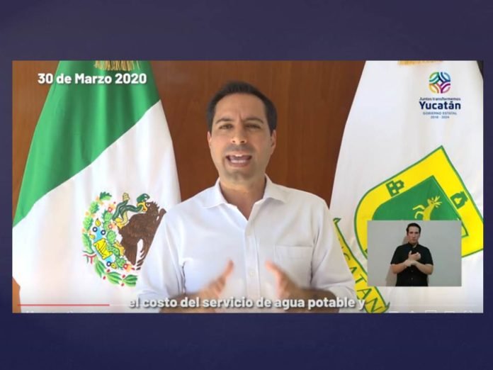 Mérida, Yucatán, 30 de marzo de 2020.- El Gobernador Mauricio Vila Dosal anunció que, para beneficiar la economía y el ingreso las familias de los 106 municipios del estado durante la contingencia por el coronavirus, el Gobierno del Estado apoyará con el pago del 100% de la cuota por el servicio de agua potable y recolección de basura correspondiente a dos meses, al igual que con el 50% en sus recibos de luz durante un bimestre a quienes mantengan sus consumos hasta 400 kilowatts hora.