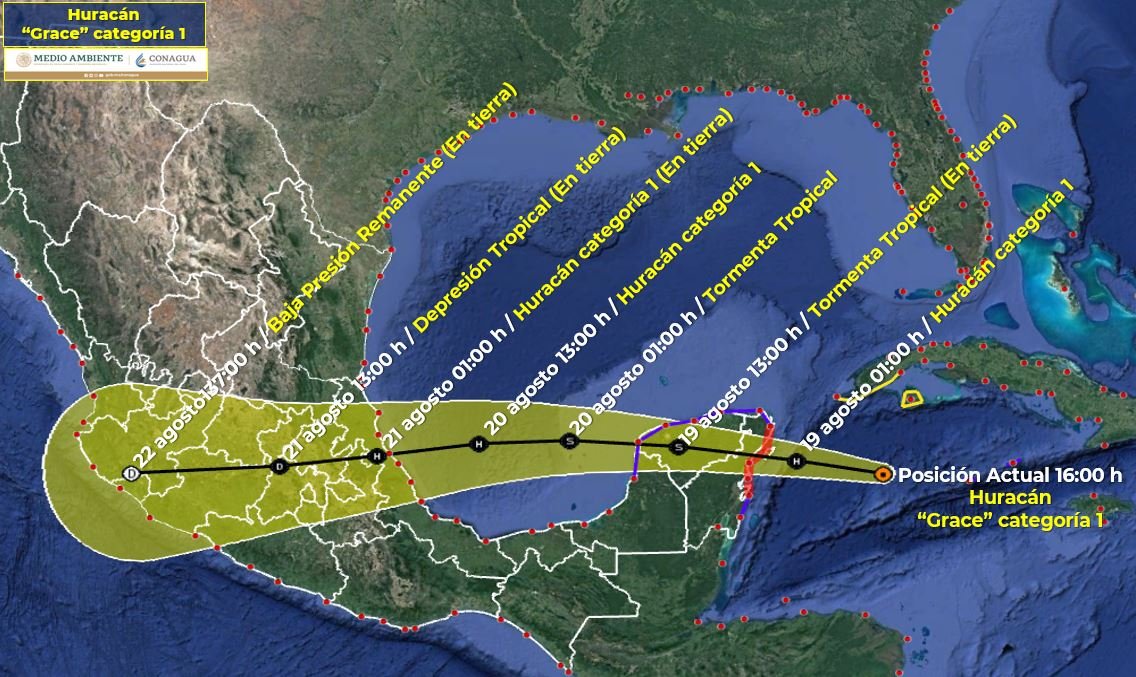 El centro del huracán “Grace” de categoría 1 en la escala Saffir-Simpson mantiene su desplazamiento con dirección a la Península de Yucatán. Se pronostica durante la tarde-noche vientos con rachas muy fuertes y oleaje elevado en las costas de Yucatán y Quintana Roo, así como lluvias muy fuertes a puntuales torrenciales en la Penísnula de Yucatán. Se mantiene en vigilancia.