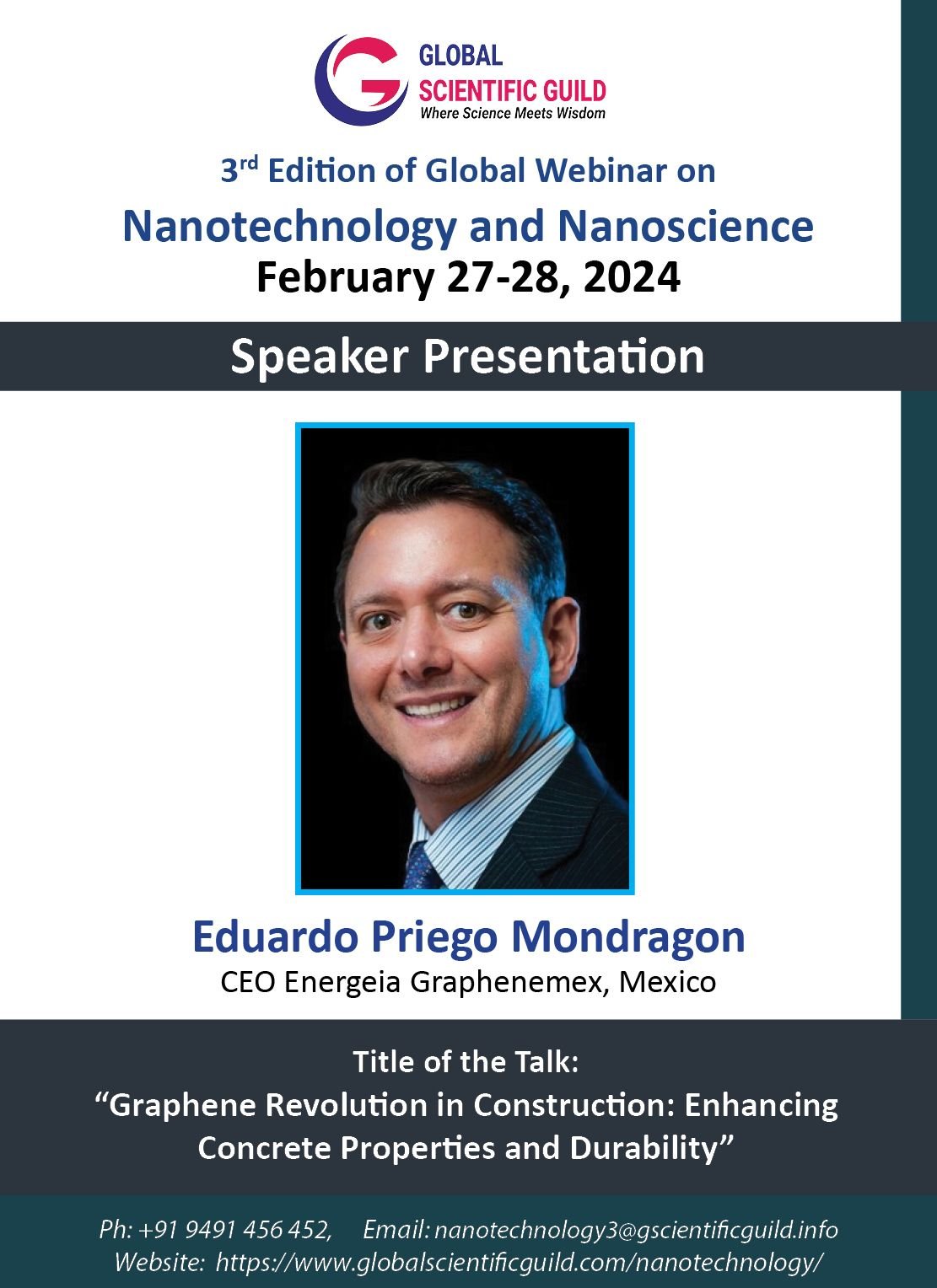 En el marco del esperado 3er Webinario Global sobre Nanotecnología y Nanociencia, programado para los días 27 y 28 de febrero de 2024, contará con la destacada participación de Eduardo Priego Mondragón, CEO de Graphenemex México, como uno de los conferencistas principales.