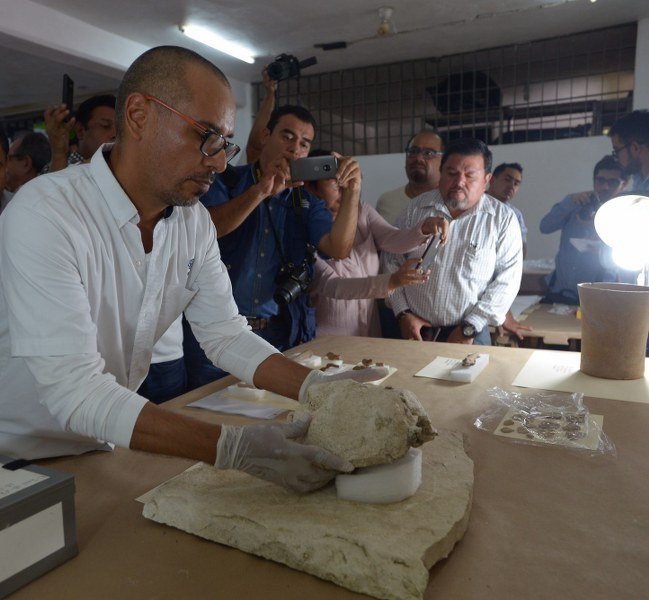 “El elemento más notorio de la #ofrenda es una cabeza modelada en estuco que representaría al gobernante #maya K’inich Janaab’ #Pakal, entre otros objetos asociados y vestigios de un estanque que habría funcionado hacia el periodo Clásico Tardío de esta cultura”, dijo el directivo.