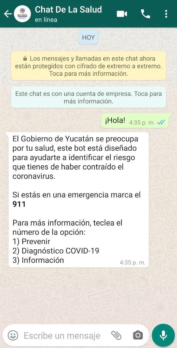 El chat de la salud de WhatsApp es tecnología yucateca, diseñada aquí y de fácil uso para complementar los esfuerzos ya realizados, como la línea 800 YUCATÁN (800 982 2826) y la página coronavirus.yucatan.gob.mx. sitio en el que está toda la información generada por el Gobierno del Estado de Yucatán hasta el momento sobre esta contingencia; ahí se encuentran los anuncios realizados por el gobernador Mauricio Vila Dosal, así como los partes diarios hechos por la Secretaría de Salud estatal.