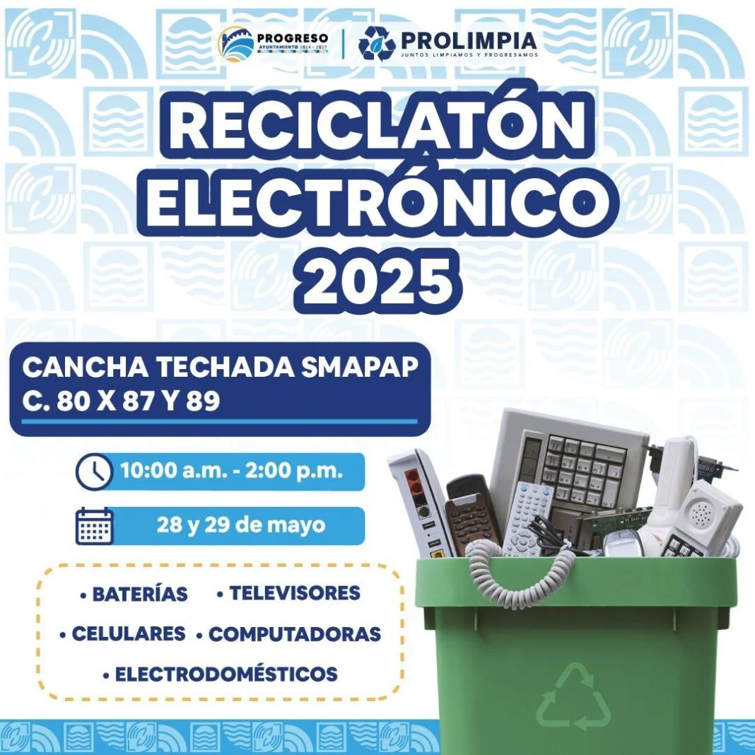 El Ayuntamiento de Progreso, encabezado por el Ing. Erik Rihani González, a través de la Dirección de Gestión Integral de Residuos Sólidos (PROLIMPIA), que dirige David Escalante Echeverría, invita a la ciudadanía a participar en el Reciclatón Electrónico 2025.