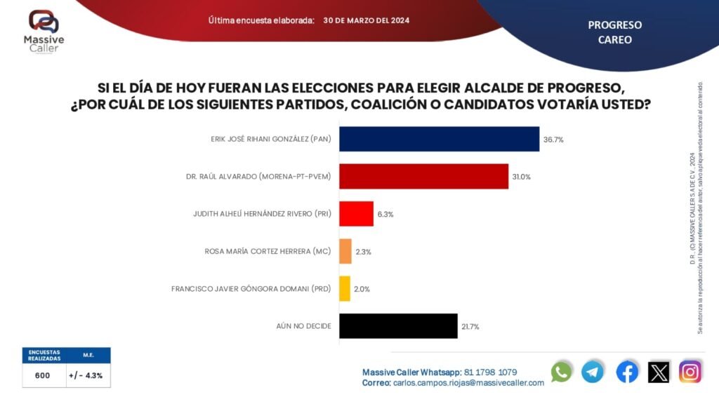 Cabe señalar que el ejercicio de la casa encuestadora advierte que un 21.7% de los progreseños aún no decide su voto. Es decir, un porcentaje mayor que los votos que alcanzan unidos los candidatos del PRI, MC y PRD.