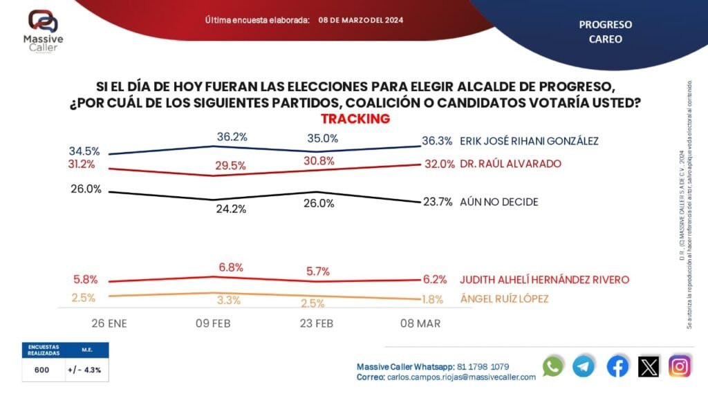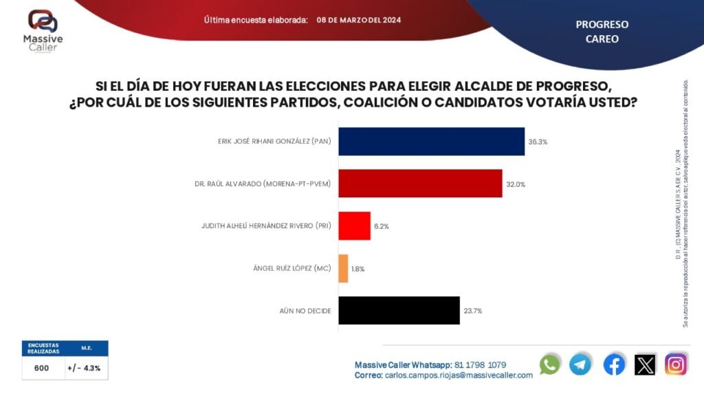 De acuerdo con la casa encuestadora Massive Caller el aspirante panista Erik José Rihani González mantiene la ventaja en la carrera por la alcaldía de Progreso. En una encuesta que difundió este sábado, el diputado local tiene el 36.3 por ciento de las preferencias, poco más de cuatro puntos arriba de su más cercano competidor.