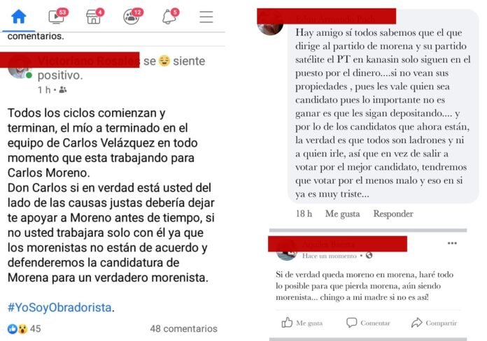 Simpatizantes y militantes del partido Movimiento de Regeneración Nacional (Morena) han empezado a manifestar el retiro de su apoyo al partido fundado por Andrés Manuel López Obrador, de confirmarse la supuesta imposición de Carlos Moreno Magaña como candidato a alcalde de Kanasín.