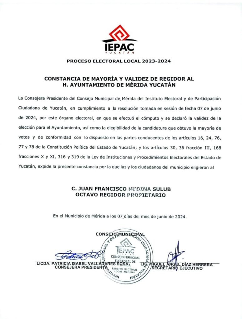 El expresidente del comité municipal de Mérida del PRI, Juan Francisco Medina Sulub, será la voz del tricolor como regidor de mayoría, en el Cabildo que presidirá la alcaldesa panista Cecilia Patrón Laviada, para integrar un gran equipo que trabajará incansablemente por las colonias y comisarías de la capital yucateca.