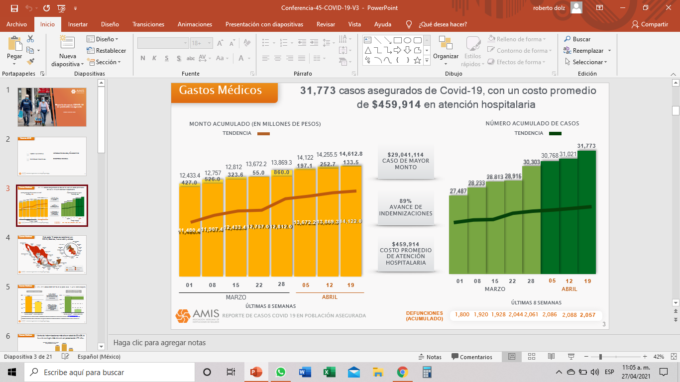 En entrevista con el Lic. Roberto Dolz, Gerente de D y C Seguros y Fianzas, informó que según lo publicado, por la Asociación Mexicana de Instituciones de Seguros (AMIS), en su corte del 21 de abril del 2021 tenían registrado 31,773 casos de vovid-19, lo que representa un cotos individual promedio de $459,914 pesos por atención hospitalaria.
