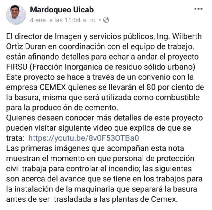 Sin embargo la “noticia” del “comunicador” incluye una imágenes de lo que, él mismo asegura, es el avance que se tiene en los trabajos para la instalación de una maquinaria que separará la basura antes de ser trasladada a la planta de CEMEX. Sin embargo el “comunicador” nunca cuestiona, tomando en cuenta que el convenio se aprobó en otra administración, ¿cuándo y cómo aprobó el actual cabildo el inicio de esos trabajos? ¿Está contemplada esa erogación en el presupuesto municipal? Si esos trabajos ya se iniciaron es de suponerse que ya se firmó con CEMEX el convenio ¿cuándo y cómo se le presentó a cabildo esa documentación para su estudio y ratificación o aprobación? y ¿cuánto erogará el municipio por esos trabajos y cuanto se le pagará a CEMEX? Y queremos dejar muy en claro nuestra postura, nunca estaremos en contra de acciones que favorezcan la calidad de vida de los habitantes de Umán, pero sí estamos en contra, y siempre seremos críticos, si esas acciones presuponen actos de corrupción y se llevan al cabo de manera poco clara y de espaldas a la ciudadanía. Freddy Ruz nunca ha aclarado la manera ilegal en que le concesionó a SIRBE la recolecta de la basura en Umán, y los actuales regidores, TODOS ELLOS, se han hecho de la vista gorda y han permitido que esa empresa actué con total ilegalidad y no le han exigido, cómo es su deber, a Ruz Guzmán que aclare el asunto. Ahora se suma este asunto de CEMEX. De hecho, el mismo Mardoqueo Uicab se muestra ineficiente e ignorante de las leyes y reglamentos, pues él mismo replicó la nota en su muro de Facebook donde se afirma que los trabajos al respecto ya se iniciaron ¿sabrá Mardoqueo, como regidor, que hasta ahora todo eso, a pesar de lucir como un bien para Umán, es ilegal puesto que el actual cabildo no ha ratificado ese convenio? Ya Mardoqueo no puede alegar ignorancia al respecto y es su deber cuestionarle al alcalde por qué se iniciaron unas obras que son relativas a un convenio que aun no ha sido presentado a cabildo para su ratificación, acorde al artículo 98 de la Ley de Gobierno de los Municipios del Estado de Yucatán. Pero con toda seguridad no lo hará…