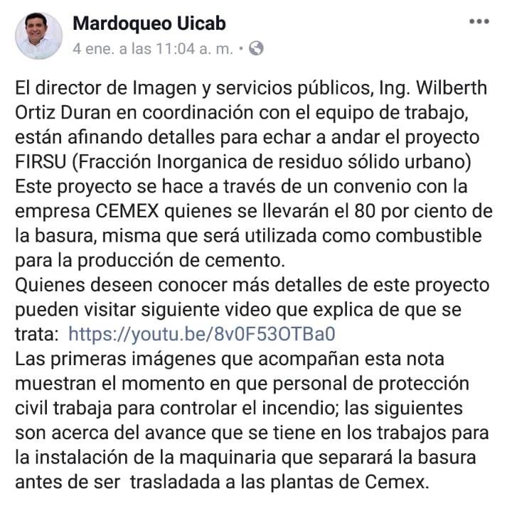 El mentado FIRSU, Fracción Inorgánica de Residuo Sólido Urbano, no es nada nuevo. De hecho las negociaciones con CEMEX para su aplicación las llevó al cabo, hace poco más de un año, Erick Pech. Y de hecho CEMEX aprobó el proyecto. Entonces, ¿si CEMEX ya estaba de acuerdo, por qué no llevó al cabo? Funcionarios de muy alto nivel y regidores de la anterior administración nos afirmaron que el impedimento vino por parte del mismo alcalde, Freddy Ruz Guzmán.