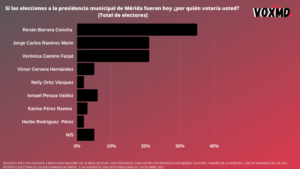 Esta encuesta efectiva fue aplicada a mexicanos mayores de 18 años de edad, CON CREDENCIAL PARA VOTAR CON residencia en MÉRIDA, Yucatán, a 1,500 en viviendas de los seis distritos electorales locales margen de error: 2.5% VOXGROUP.