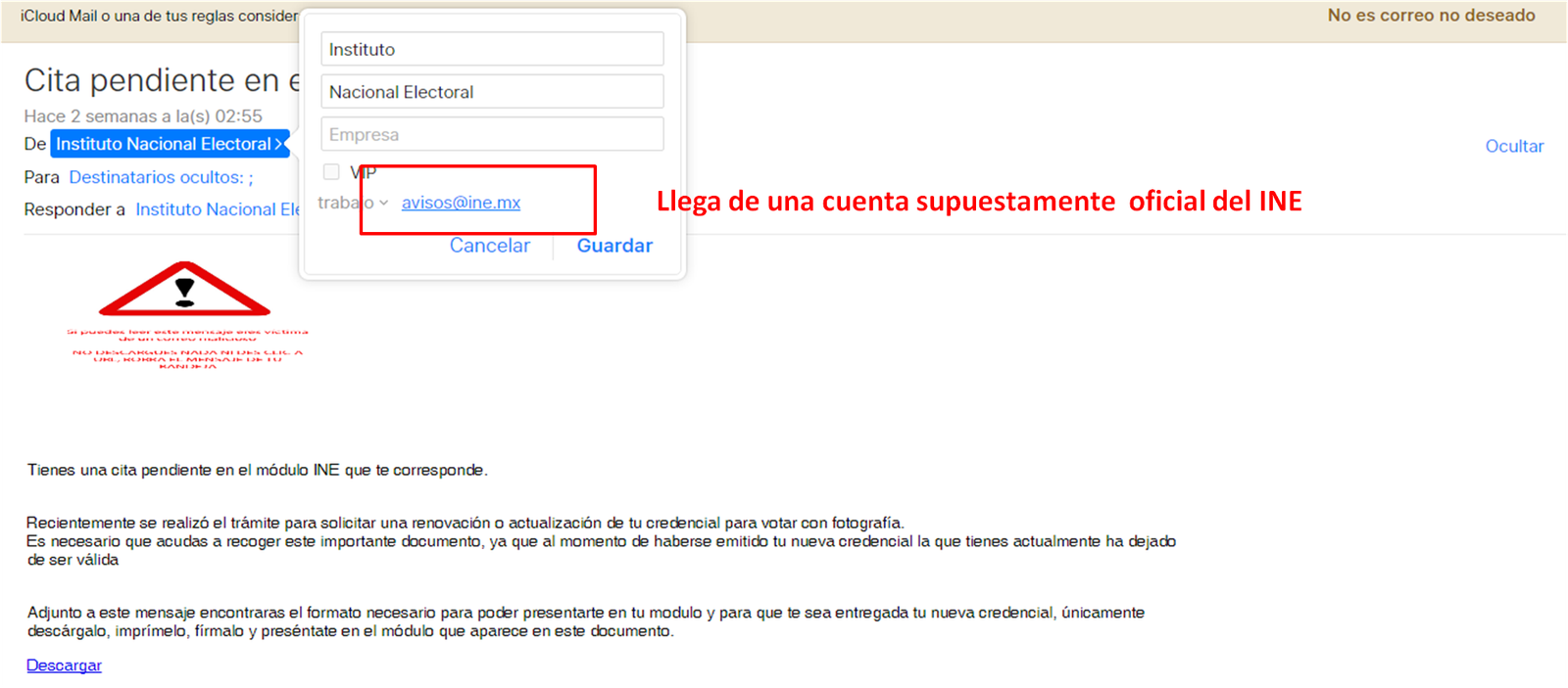 En esta ocasión el correo electrónico con el virus hace alusión a una supuesta cita pendiente en el modulo del INE y exhortan al destinatario a descargar un archivo adjunto.