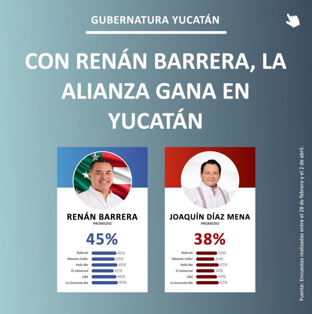 El promedio de las diferencias entre las seis casas, de 45 puntos para Renán Barrera sobre 38 de Díaz Mena, resumió la misma tendencia que muestran seis casas encuestadoras con mayor credibilidad y sus resultados son ajenos a la manipulación de magnitudes risibles como la encuesta que la asesora de Ivonne Ortega Pacheco, Gabriela Gómez López encarga a sus socios del despacho “De las Heras”, según la cual, el candidato guinda para el cual trabaja en el “cuarto de guerra”, Joaquín Díaz Mena, siempre está por más de 20 puntos arriba de Renán Barrera.
