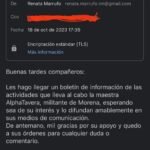 A través de su correo renata.marrufo.rm@gmail.com la funcionaria estatal envió ayer un comunicado acompañado con el siguiente texto: “Buenas tardes compañeros: les hago llegar un boletín de las actividades que lleva al cabo la maestra Alpha Tavera, militante de Morena, esperando sea de su interés y lo difundan amablemente en sus medios de comunicación. De antemano, mil gracias por su apoyo y quedo a sus órdenes para cualquier duda o comentario”. Incluyó fotografías.